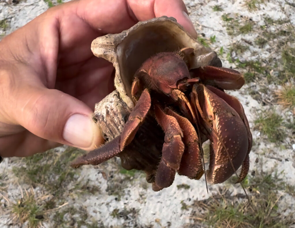 Eremitkrabborna här är vackra och finns överallt. Speciellt på kvällen kommer de fram och man får sicksacka så man inte trampar på dem. Skalen är ungefär som en knytnäve, och knöliga, och absolut inte sköna att trampa på. Ingen har ju skor. För att inte tala om att den stackars krabban förlorar sitt hus, och kanske sitt liv.