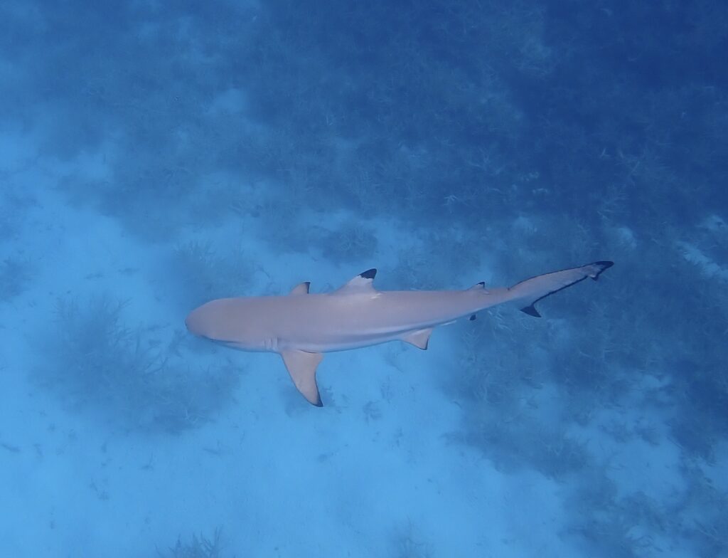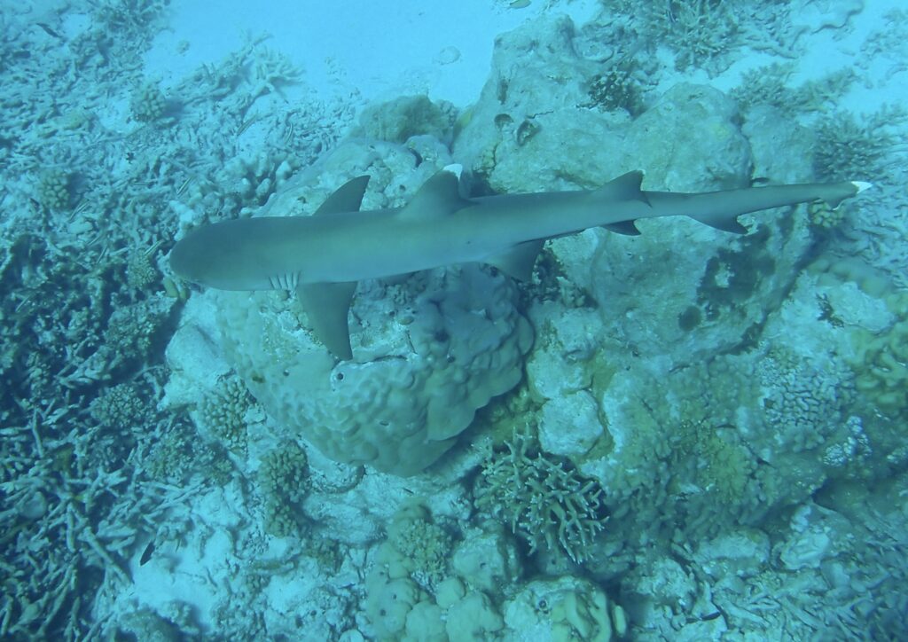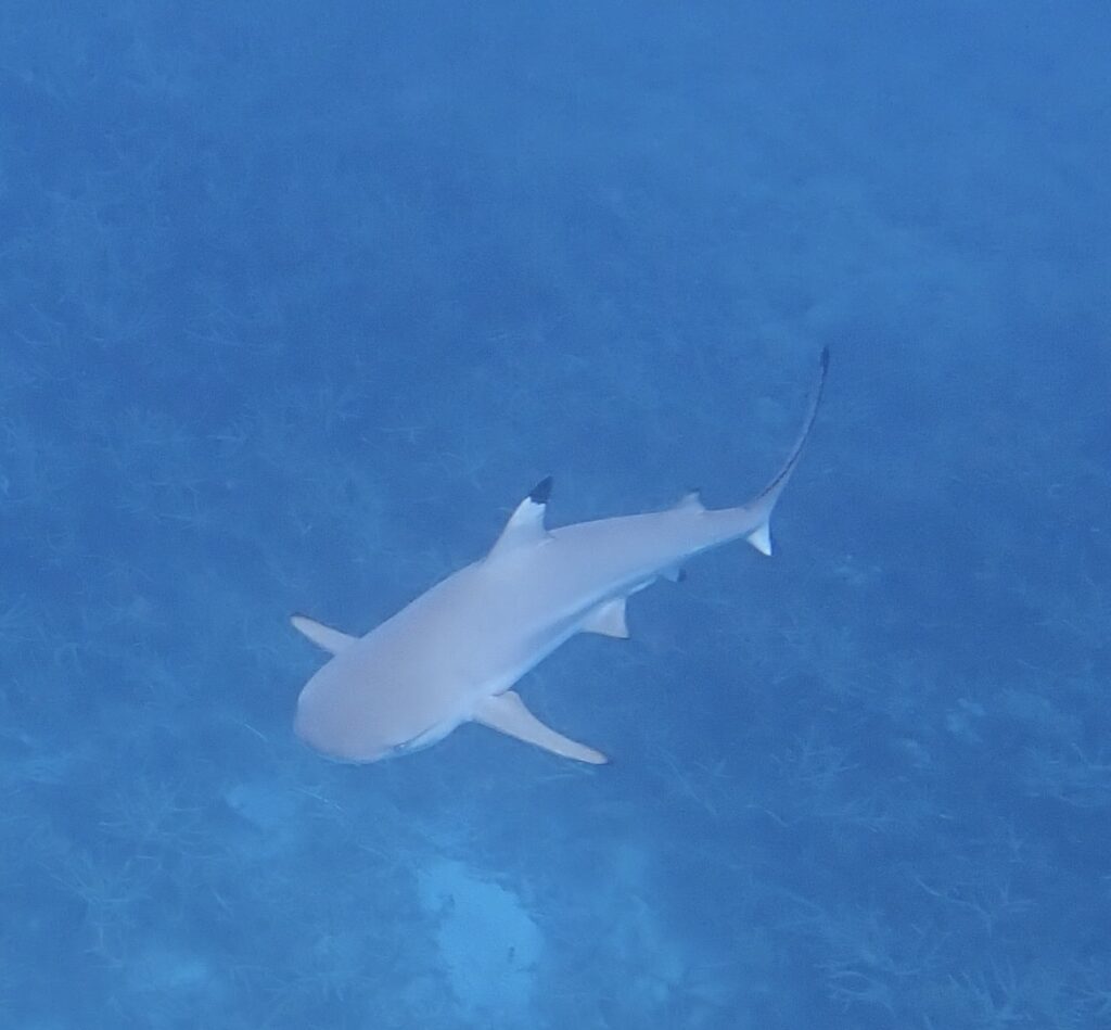 Googlade black tip. Läser att det är en nyfiken och lätt bortskrämd haj som inte är farlig för människor om inte mat är involverat. Nåja, inte ofta man släpar ned middagen under vattnet. Nöjd går jag över till white tip. Det är en helt annan typ av haj det. Opportunistisk och agressiv. Känd för att utgöra ett stort hot mot överlevare vid fartygsförlisningar. Jösses, är ni i vattnet med dem??