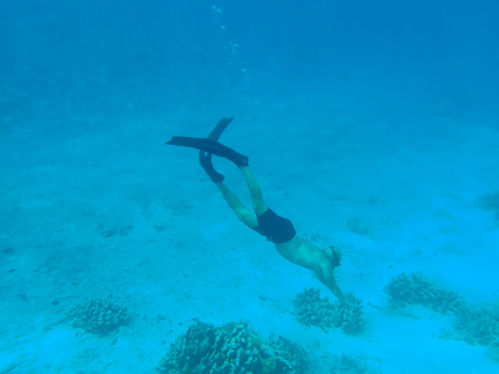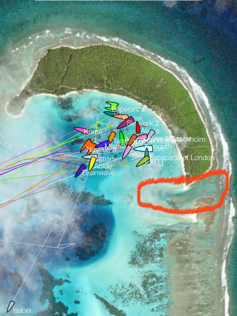 Här finns det en ravin under vattnet och i den blir det väldigt strömt. Kallas för The Rip. En jättefint och rolig driftsnorkling. Se där jag har ritat på bilden. Man kliver i eller blir skjutsad i jollen till där det bryter och sedan åker man med i 5 knop. Mycket fint att titta på. Fram och tillbaka, fram och tillbaka, sådär kan man hålla på. Vattnet är kristallklart. Vi har sett white tip reef shart, stor napoleon och massa färgglada småfiskar. De hänger på samma ställe så man lär sig var man skall leta efter dem.