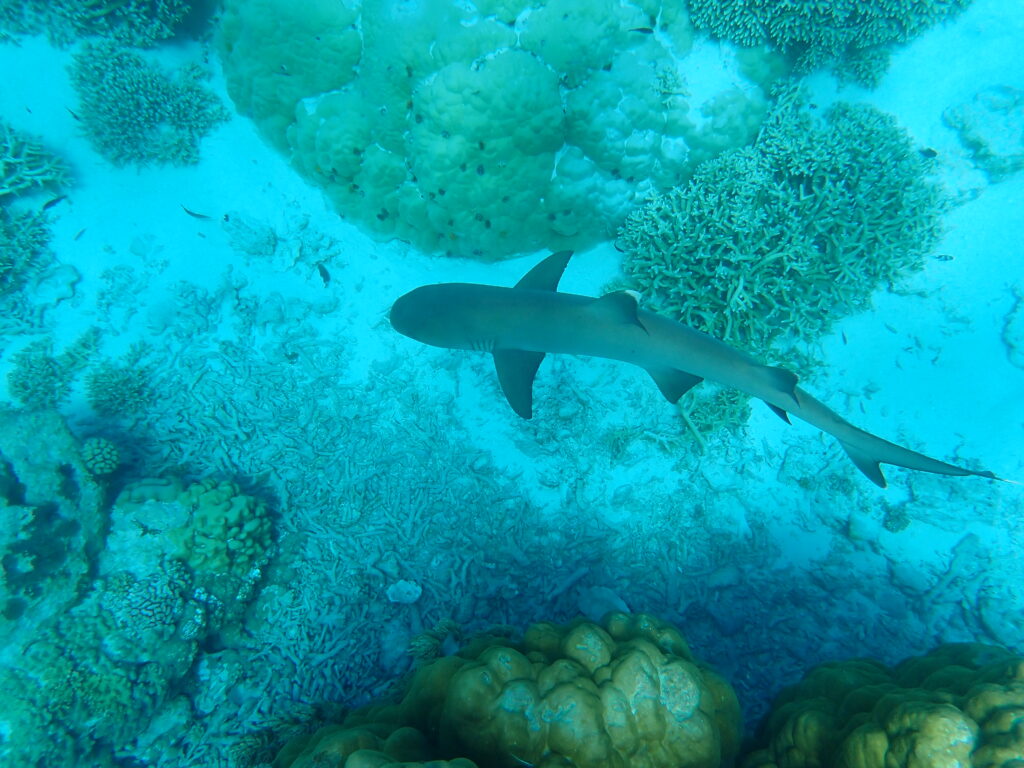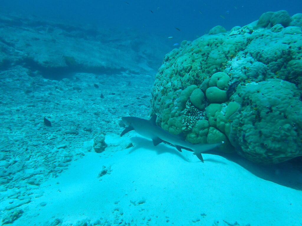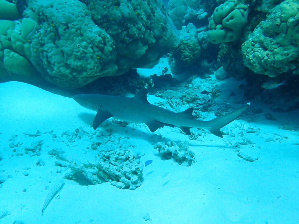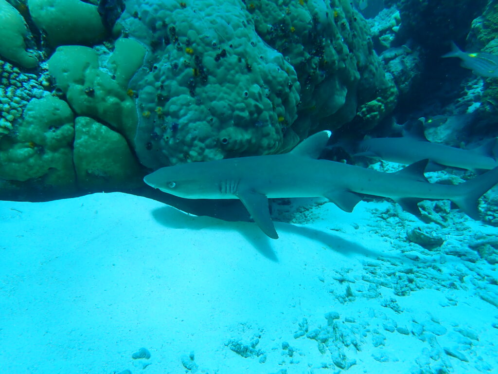 Hej Lotten, det är lugnt. White tip reef shark är inte farliga för människor. Det finns oceanic white tip som inte är lika snälla. Det finns inga oceanic white tip här. Ej heller stora vita hajar. De kan dock finnas i Sydafrika dit vi skall sen. Kanske hittar jag ett ställe där jag kan stå i en bur i vattnet nära dem? Skulle vara kul!