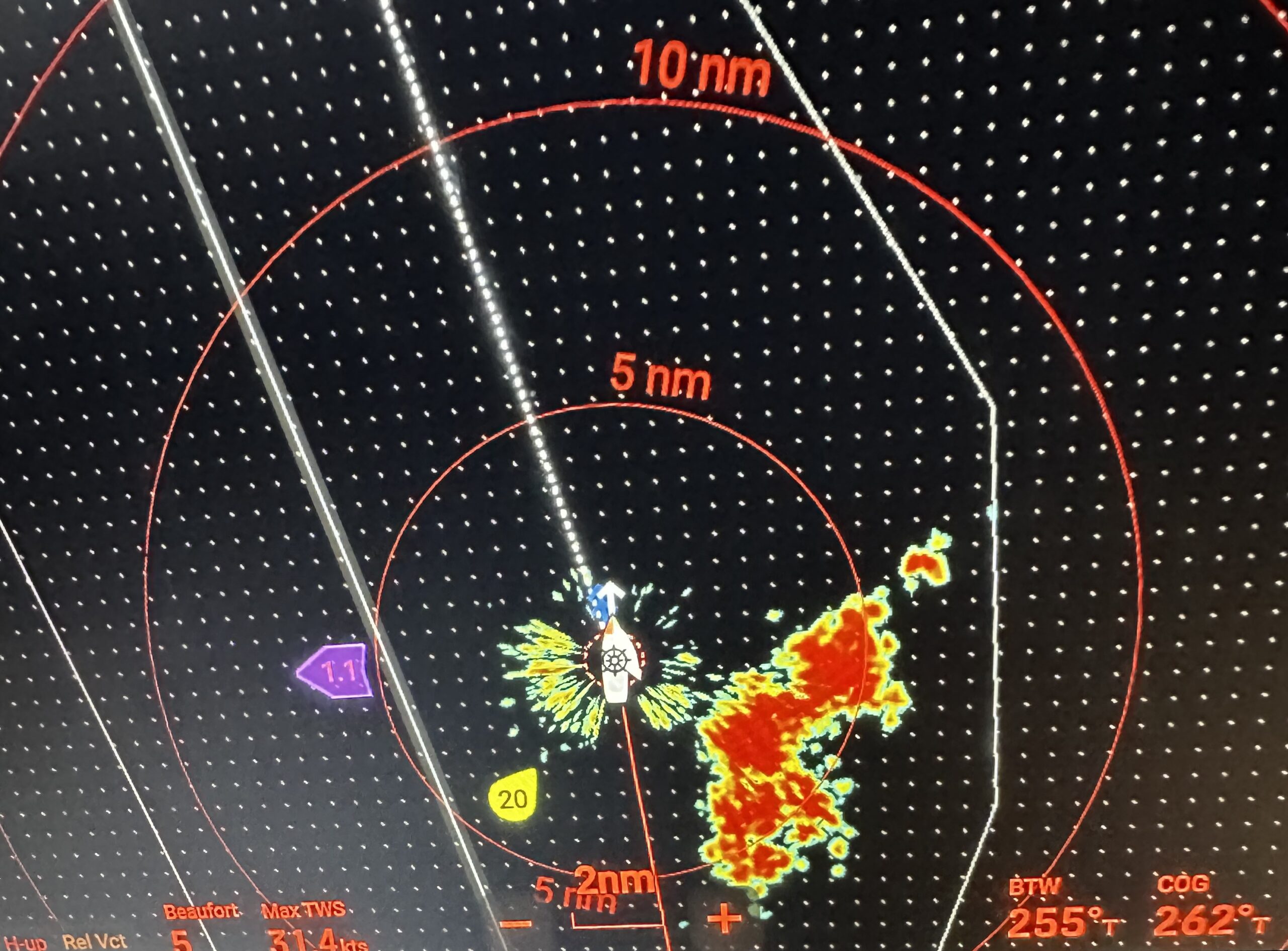 Squalls, bäst att hålla sig undan. Regn, mkt starka vindar och framförallt vind som kommer överallt ifrån och ändras supersnabbt. På radarbilden syns de som arg röda. Häromnatten kom de som i ett pärlband, den ena efter den andra, turligt nog precis akter och styrbord om oss. Den sista hade en svans som inte var lika snäll och vi kom precis i kanten på den. Mindre kul.