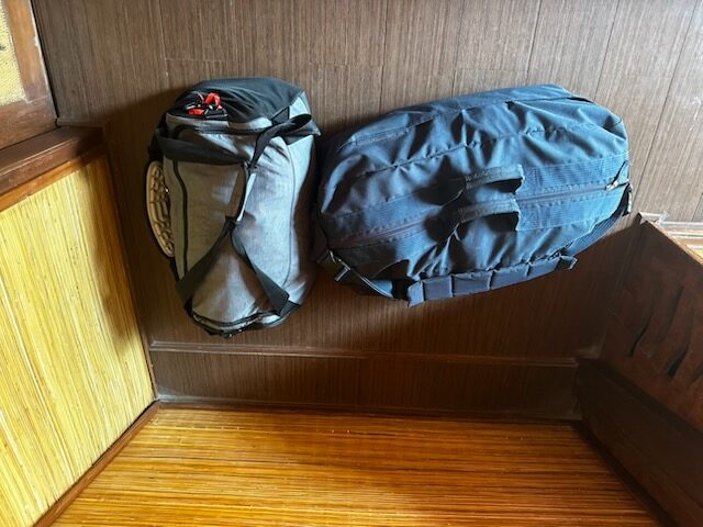 Jag har två väskor totalt 27 kg. I den ena som väger 12 har jag fullt sjöställ ink stövlar, flytväst o extra patroner, säkerhetsele, 4 kg sjukvårdsartiklar, extra telefon och extra prylar som typ glasögon, solglasögon, keps, hårddisk, laddarsladd etc. Allt sånt som blir jobbigt om det går sönder eller tappas. Lite svårt att köpa nytt ju så jag har i princip två av allt 😄