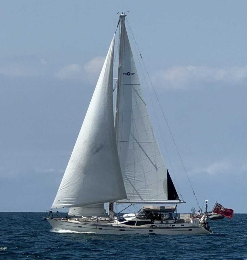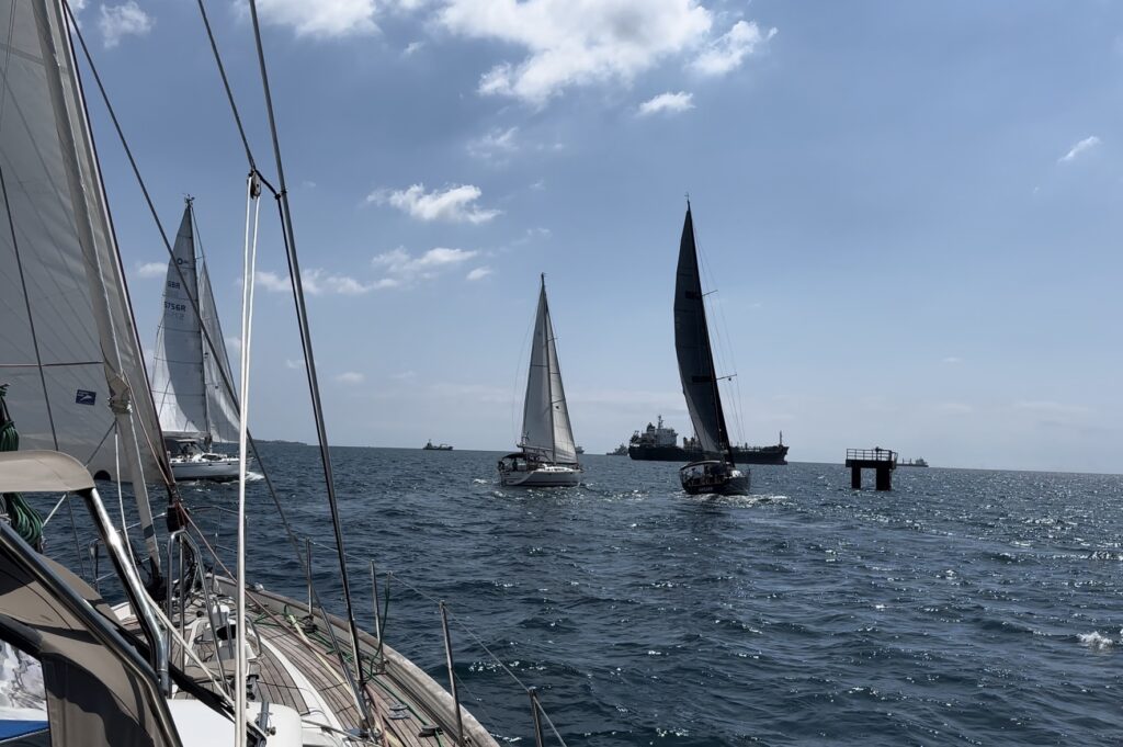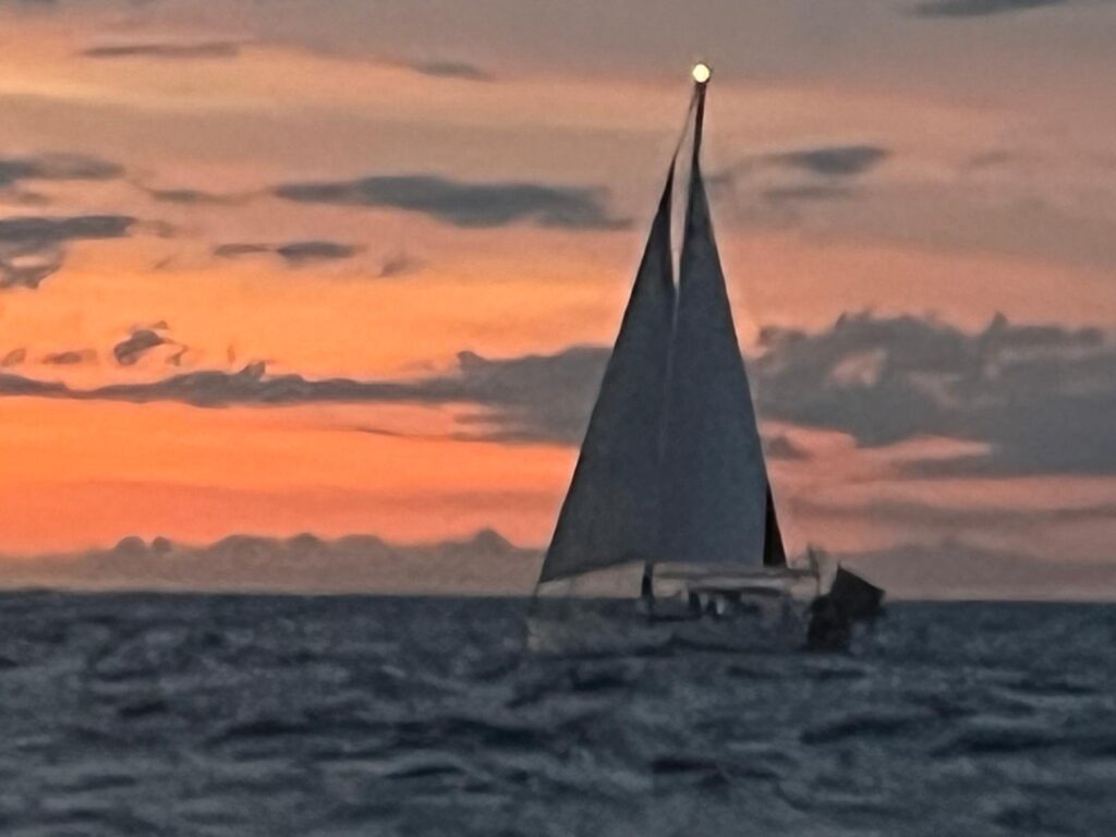 Just nu är det en underbar solnedgång. Vi gör 8,5 knop har bra vind in från sidan. Vi har 4 båtar framför oss, varav 3 är inom synhåll. En båt precis bredvid oss, som tog bilden nedan, och resten är bakom. Det går bra nu.
